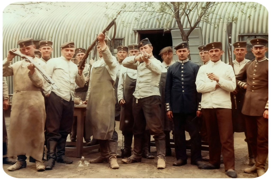 Quelle: Heimatglocken 12/1915 - Bild: Waffeninspektion und Gruppenbild aufs dem Fundus Franz Baders (bearbeitet durch KI)