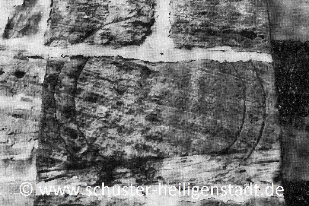 „E. Zinner schreibt in seinem Buch „Alte Sonnenuhren an europäischen Gebäuden“ von „Resten einer mittelalterlichen Sonnenuhr an der Marienkirche in Heiligenstadt“. Dieser Notiz ging ich nach und fand auch spärliche Überbleibsel dieser einstigen Vollkreissonnenuhr. Am dritten Pfeiler vom Chor aus gesehen zeichnen sich in einer Höhe von 5 Metern Bruchstücke von zwei Vollkreisen ab. Zur besseren Erkennung dieser Kreise auf dem Foto wurden sie mit einem Holzkohlestift nachgezogen.