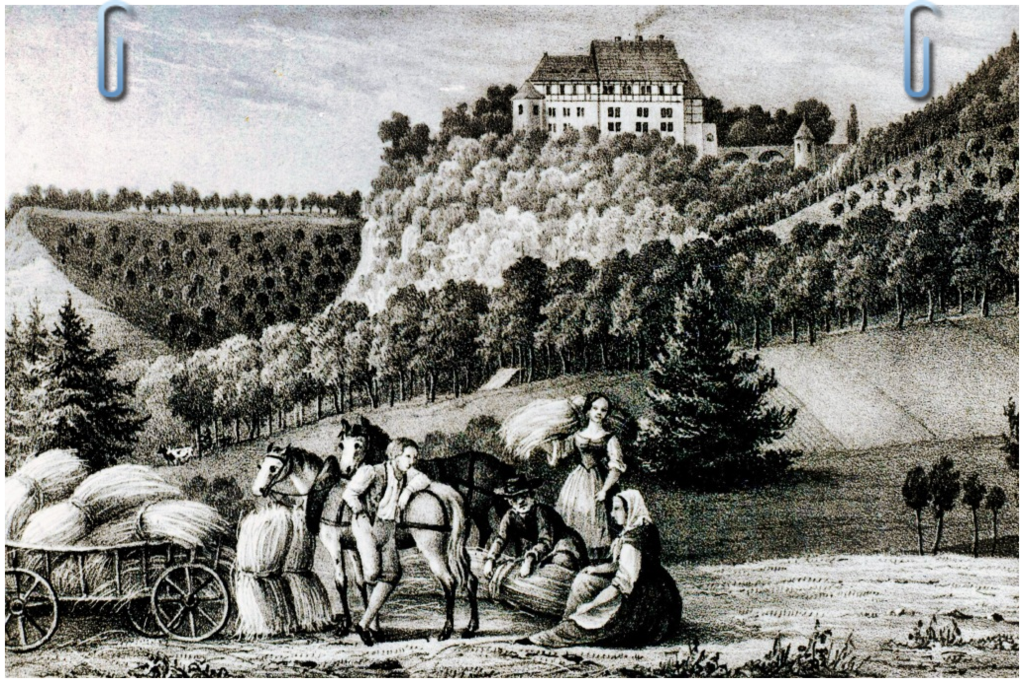 Quelle: Eigene Aufzeichnungen; Die Burg Bodenstein im Eichsfeld – Bild: Zeichnung von Duval aus der Zeit um 1840