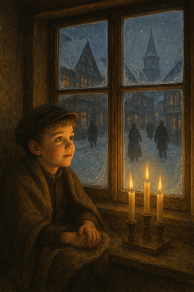 An kalten Tagen saß Jakob oft am kleinen Fenster zur Straße. Im Winter war das Glas von einer zarten Eisschicht überzogen, und er strich mit dem Finger Muster hinein, durch die er die Menschen draußen vorbeigehen sehen konnte: Männer in dicken Mänteln, Frauen mit Tüchern um den Hals, Kinder, die mit roten Wangen im Schnee spielten. Die Großmutter legte ihm dann manchmal eine Decke um die Schultern und erzählte Geschichten von früher – von warmen Sommern, strengen Wintern und Wundern, die besonders in der Adventszeit geschehen konnten.