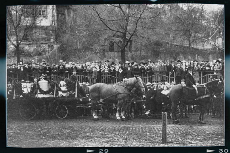 Die Glocken wurden 1924 feierlich von Bahnhof zur Ägidienkirche gefahren. Das Geländer im Hintergrund befand sich am Weg Steingraben Richtung „Stadtpark". Die Straße gibt es heute noch, sie führt hinter dem alten Güterbahnhof entlang.